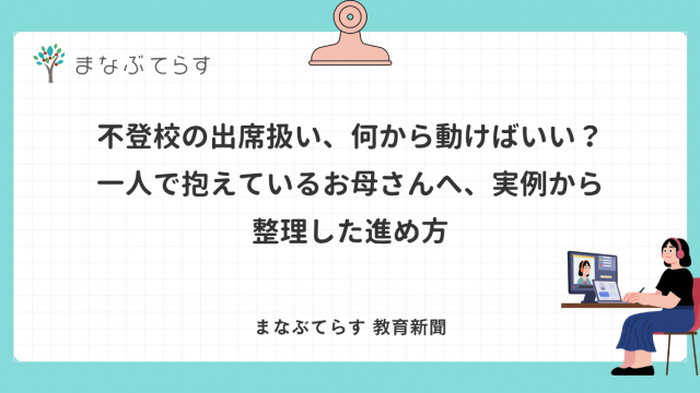 不登校 不登校の出席扱い、何から動けばいい?一人で抱えているお母さんへ、実例から整理した進め方 2026年4月12日 まなぶてらす編集部 「出席扱いになるって聞いたけど、実際どうすればいいの?」 フリースクールに通わせたり、ICT教材を使ったり、何かしら動いているのに、そ …