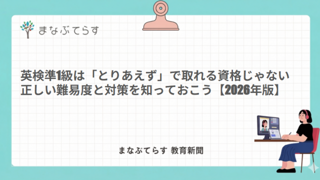 教育コラム 英検準1級は「とりあえず」で取れる資格じゃない|正しい難易度と対策を知っておこう【2026年版】 2026年4月4日 まなぶてらす編集部 「英検準1級があると受験に有利」——そう聞いて、対策を始めようとしている方も多いと思います。 ただ、少し立ち止まって考えてほしいのです。準 …