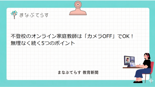不登校 不登校のオンライン家庭教師は「カメラOFF」でOK!無理なく続く5つのポイント 2026年4月10日 まなぶてらす編集部 不登校の子にオンライン家庭教師が向くケースとはどのような場合でしょうか? 不登校の子どもを持つご家庭が家庭教師を検討するとき、最初に気 …
