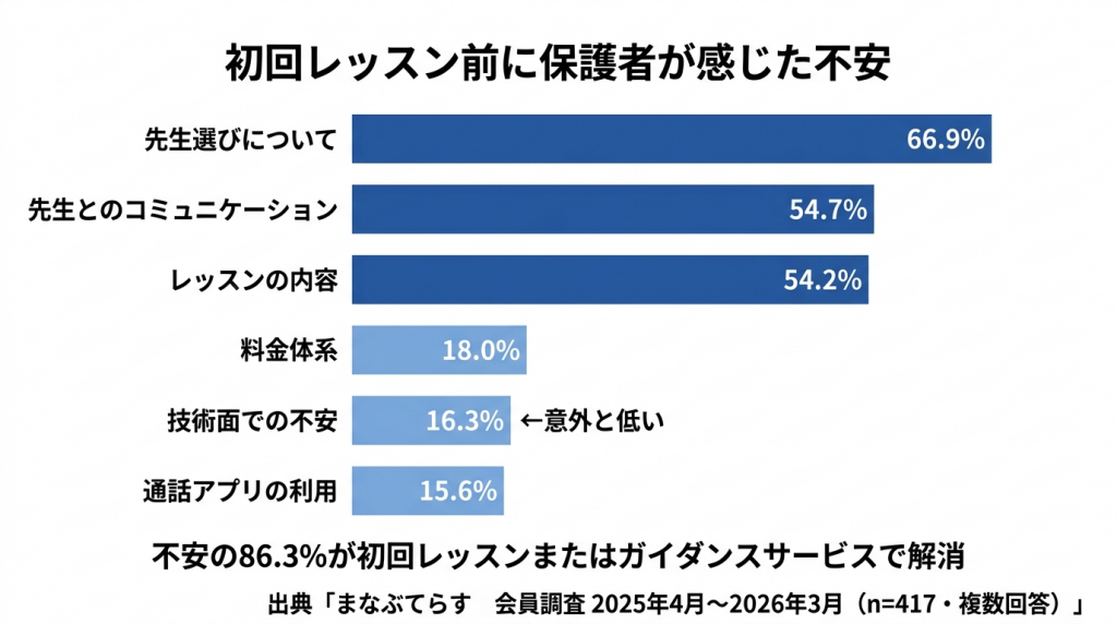 本調査で、初めてオンライン家庭教師のレッスンを受ける前に保護者が最も不安に感じていたのは「先生選びについて」で66.9%でした。一方、技術面の不安は16.3%にとどまっています。「オンラインだから機材が心配」というイメージとは逆に、保護者の関心は「機材」よりも「人」に集中しているのです。